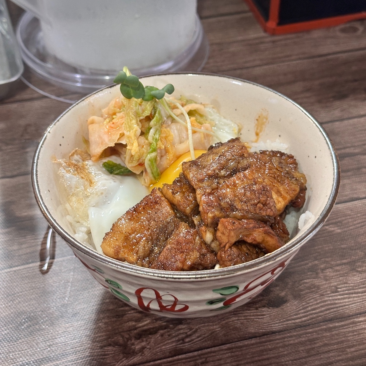 저는 일반 사이즈로 주문했는데요, 결과적으로 스페셜을 시킬 걸 싶었어요. 😂 일반도 적지는 않는데, 삼겹살이 조금 더 있었으면 좋겠다는 느낌이였어요 :) 숯불에 구운 삼겹살의 불향이 정말 강하게 느껴지고, 고기는 부드럽고 촉촉했어요. 위에는 계란과 김치가 곁들여져 있는데, 이 조합이 한국인 입맛에도 딱 맞더라고요.