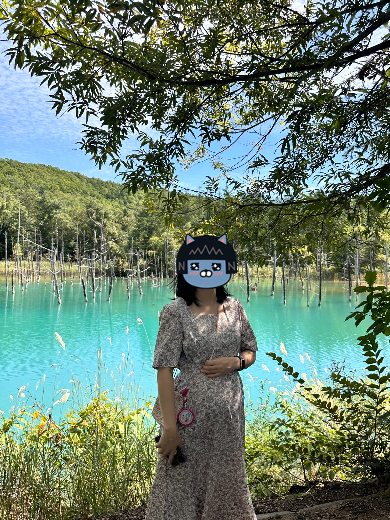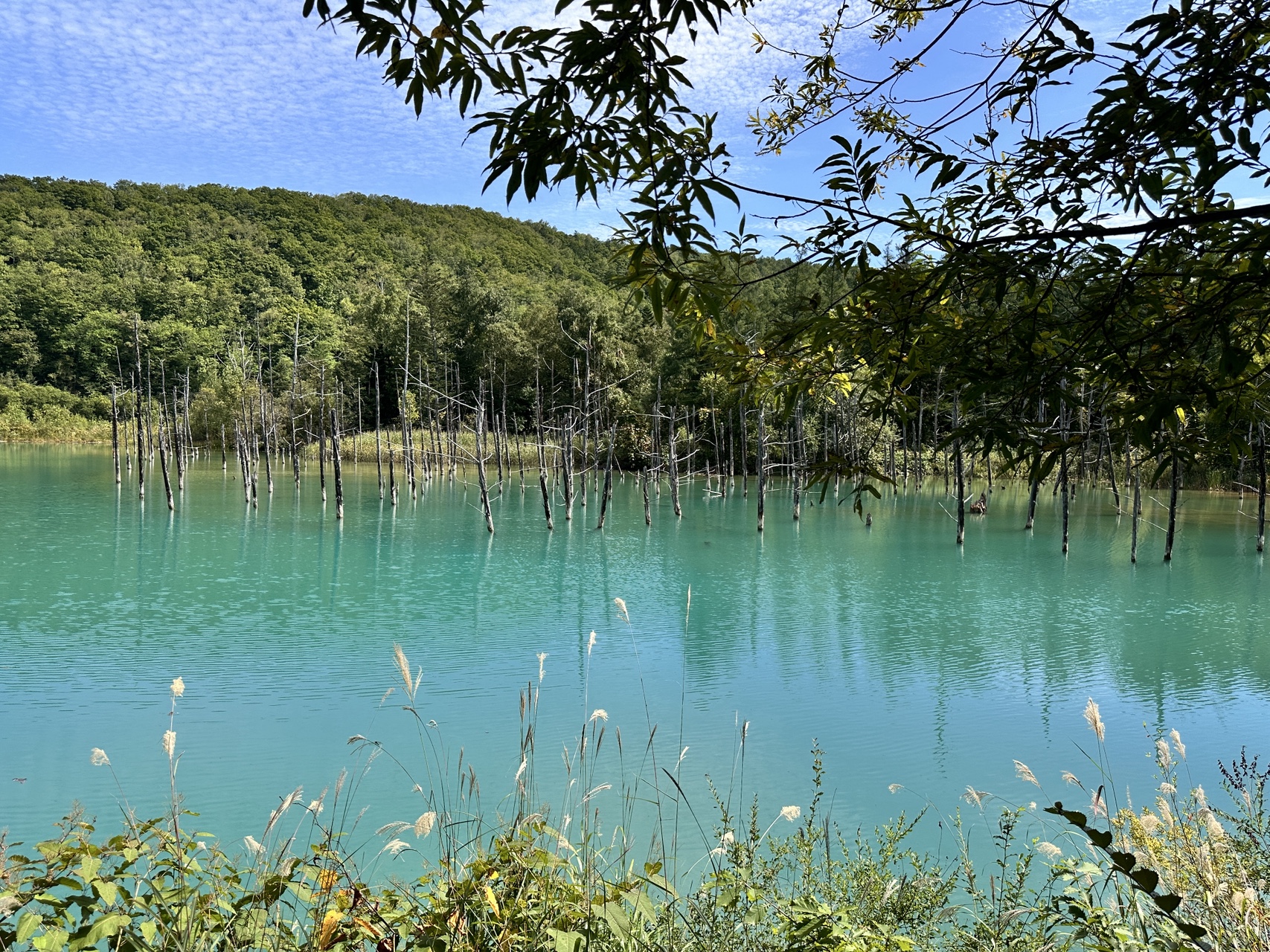 이름처럼 호수가 파란빛을 띠고 있어 정말 예뻤어요. 날씨가 좋아서 물빛이 더 선명했고, 사진도 인생샷이 나오더라고요. 물이 청색인 이유는 석화질과 온천수 내부에 알루미늄이 있기 때문이라고 해요. 저 멀리에는 죽은 나무가지들이 있는데, 일부러 나무들은 나뒀다고 했어요.