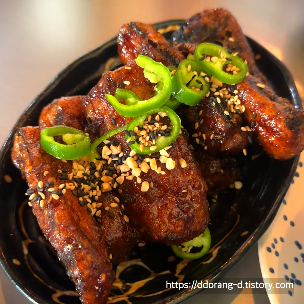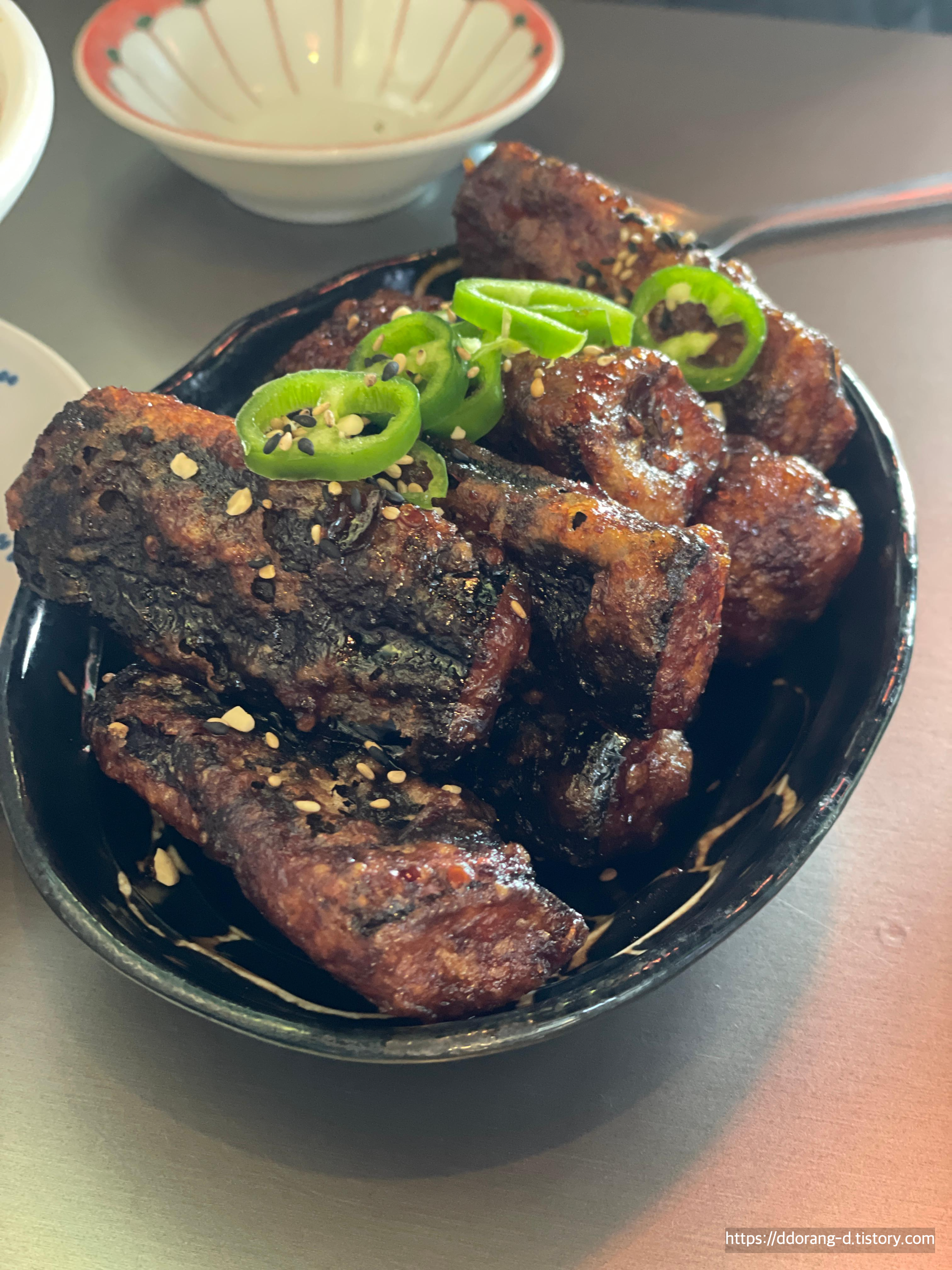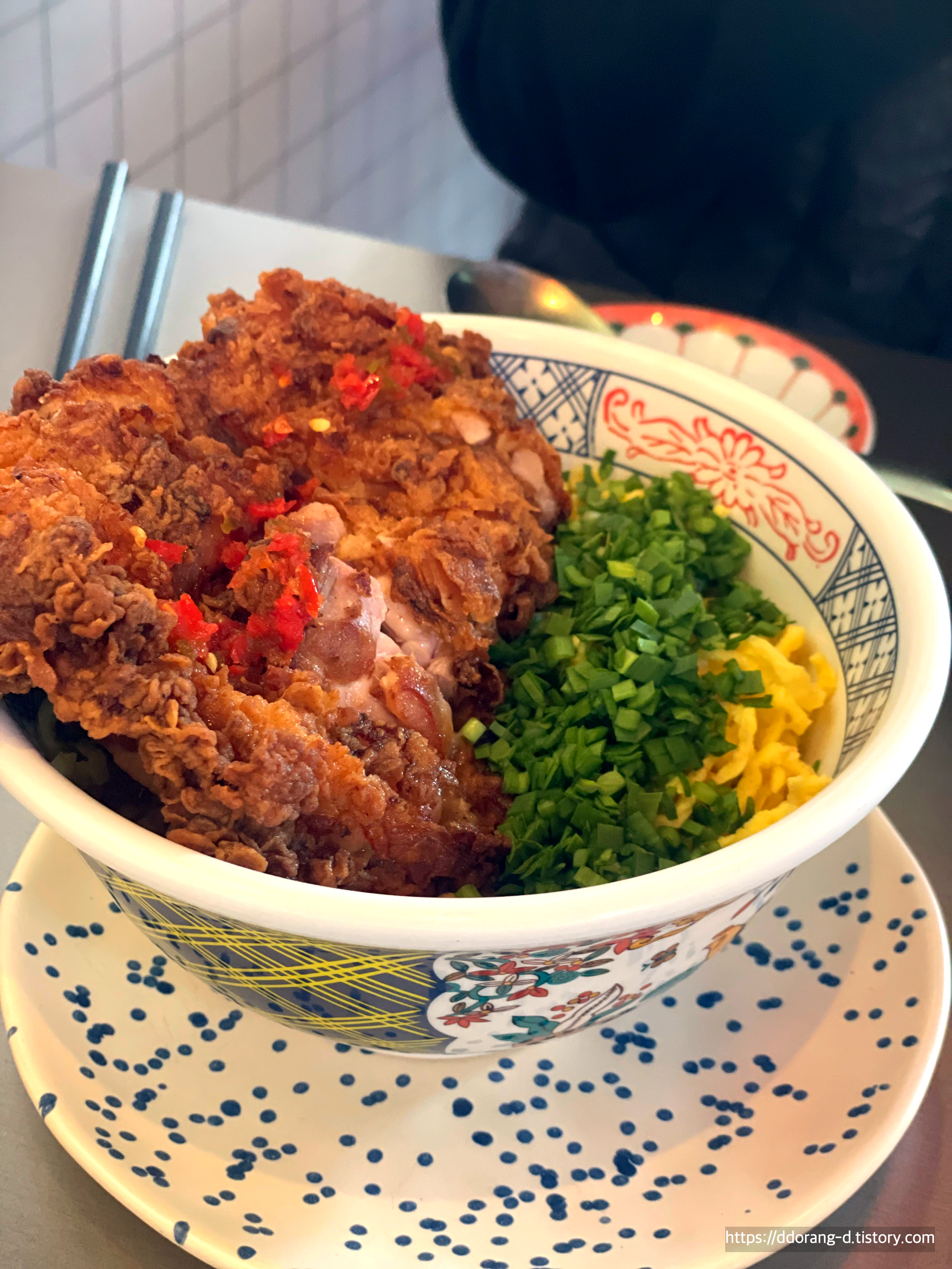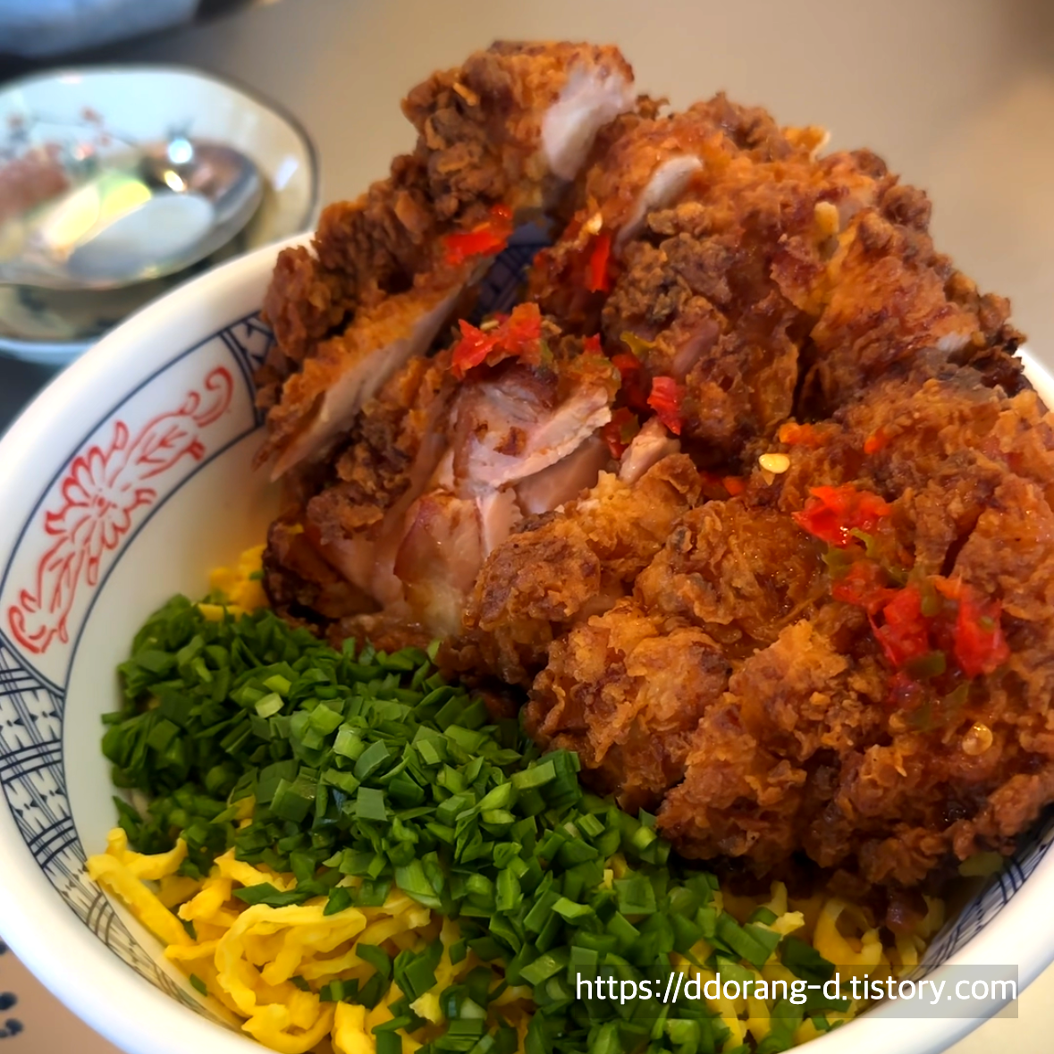 바삭하게 튀긴 치킨 위에 소스를 듬뿍 얹어낸 덮밥. 달짝지근하면서 짭조름한 맛이 밥과 잘 어울렸습니다. 양도 적지 않아 한 그릇 먹으면 든든했어요.